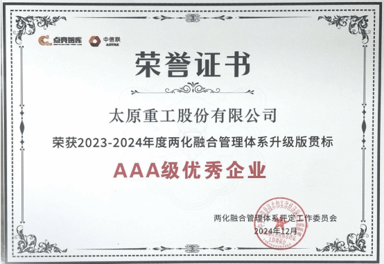 近日,乐鱼在线注册_乐鱼(中国)成功获评2023-2024年度两化融合管理体系升级贯标AAA级优秀企业,成为山西装备制造业首家被工业和信息化部认可的国家两化融合管理体系AAA级的企业,标志着公司成为行业前列的两化融合管理示范企业。